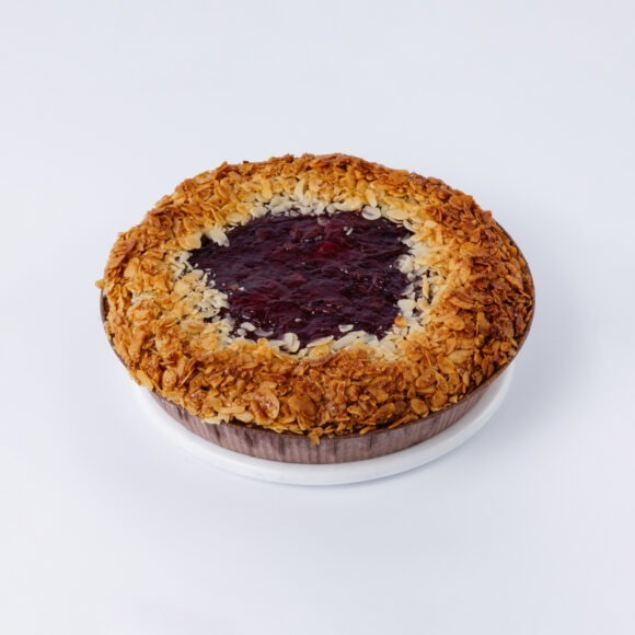 Песочное тесто, хрустящий слой из фундука, вишневый конфитюр