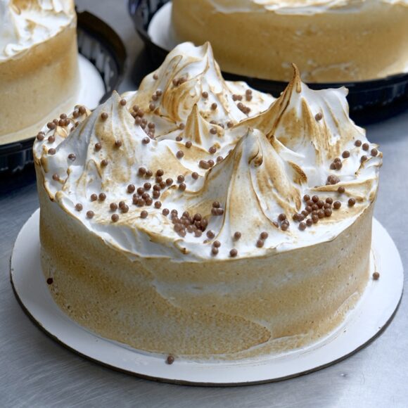 ванильный кексовый бисквит, шоколадный мусс с молочным «Криспи», итальянская меренга